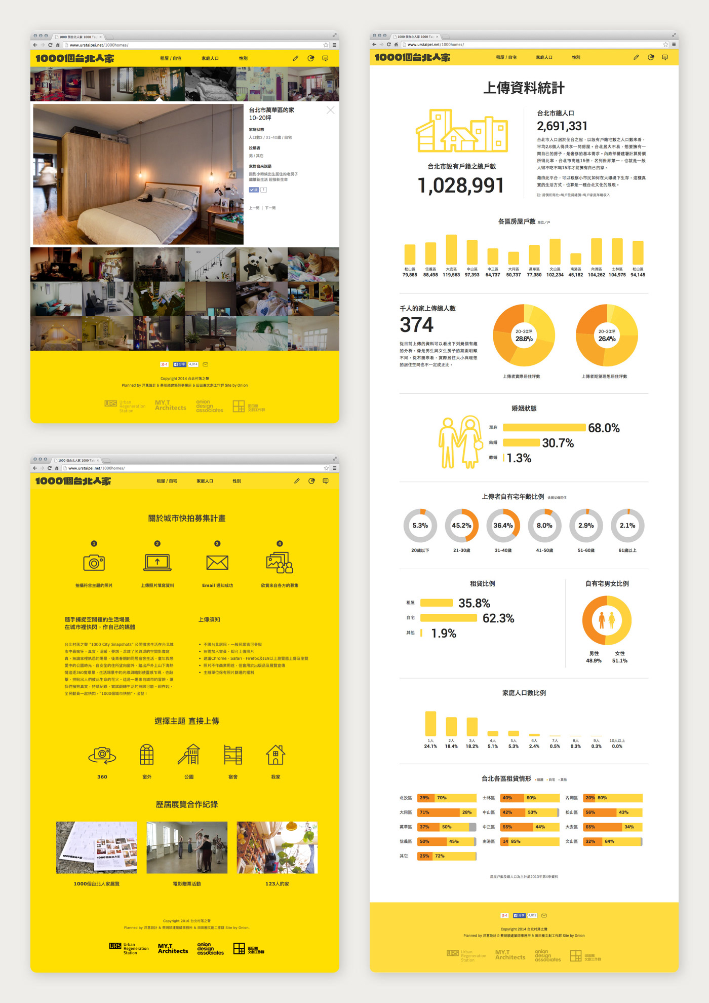 家,是城市的縮影;城市,是你我塑造可共享的未來。網路平台 「1000個台北人家」募集計劃,企圖將常民底層隱性的真實城市切面,翻轉成為顯性的都市全貌,讓民眾從接收者轉化為參與者與資訊提供者,一方面廣徵民眾上傳自己的住家照片,為自己發聲,完整化這城市的面貌;另一方面組織特派員深入國宅、傳統市集、眷村或其它各階層等住家直擊拍攝,擴大城市切面的多元面向。公開的募集照片方式,大量的影像匯集,透過整理與比對,回應台北人的真實居住面貌與設計能量來源。