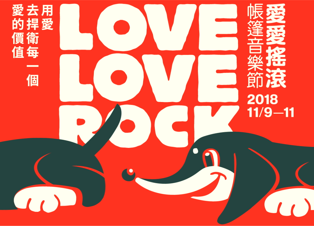 單身狗,1111光棍節,找到愛《Love Love Rock 愛愛搖滾帳篷音樂節 2018 11.9-11 》。延續愛的大議題 ,主張不分國籍、性別、物種、不修飾且勇敢地去愛。一開始就設定具話題性的「單身狗」為題,以角頭音樂虎神哥的臘腸狗「蕾蕾」為藍本,塑造出逗趣的造型 Mascot,為 2018 音樂節的品牌識別與精神象徵定調。狗狗友愛的直白肢體語言,暗示單身者對愛的搜尋、探索、渴望、曖昧與歡愉。