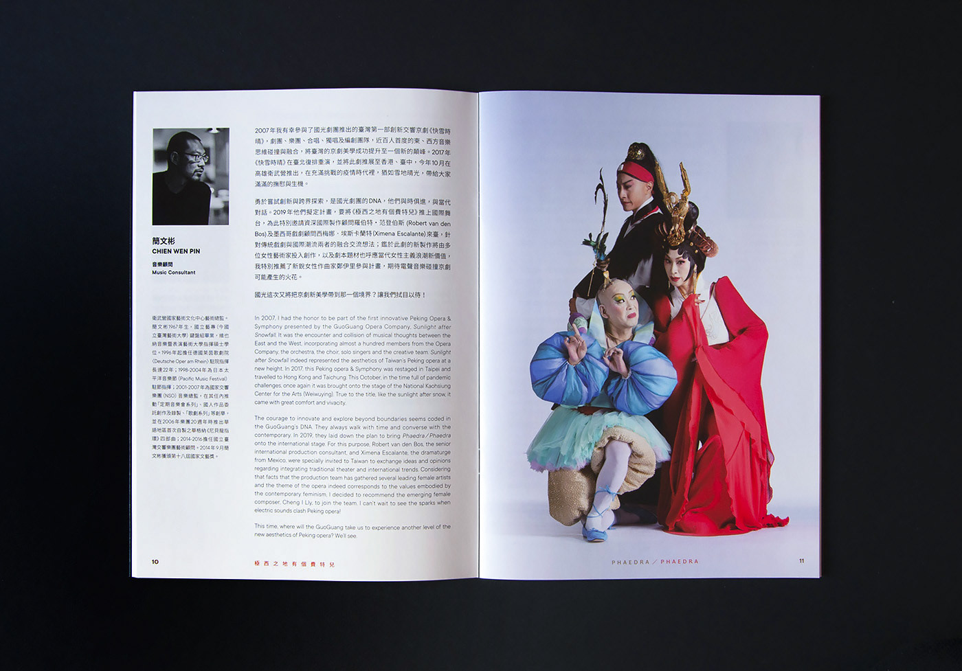 文本改編自古羅馬時代劇作,是一顛覆傳統京劇、融合電聲、影像的西劇中演新作。視覺在京劇美感底蘊之下,同時呈現劇作的創新企圖,整體以紅黑金三色定調,各自代表倫理禁忌與私密情慾的紅色、大面積黑色則為暗黑不可控的自我吞噬、金色則為外在有形假象的美好尊貴與輝煌。雙主角戲劇感的表情在暗黑中,創造出耐人尋味的情緒與張力,將觀眾帶入劇情裡的糾葛與不可自拔。